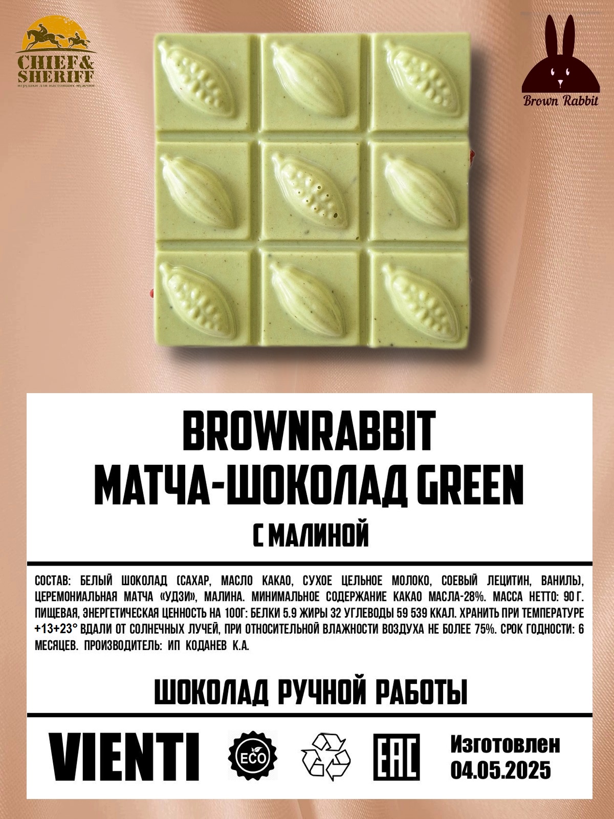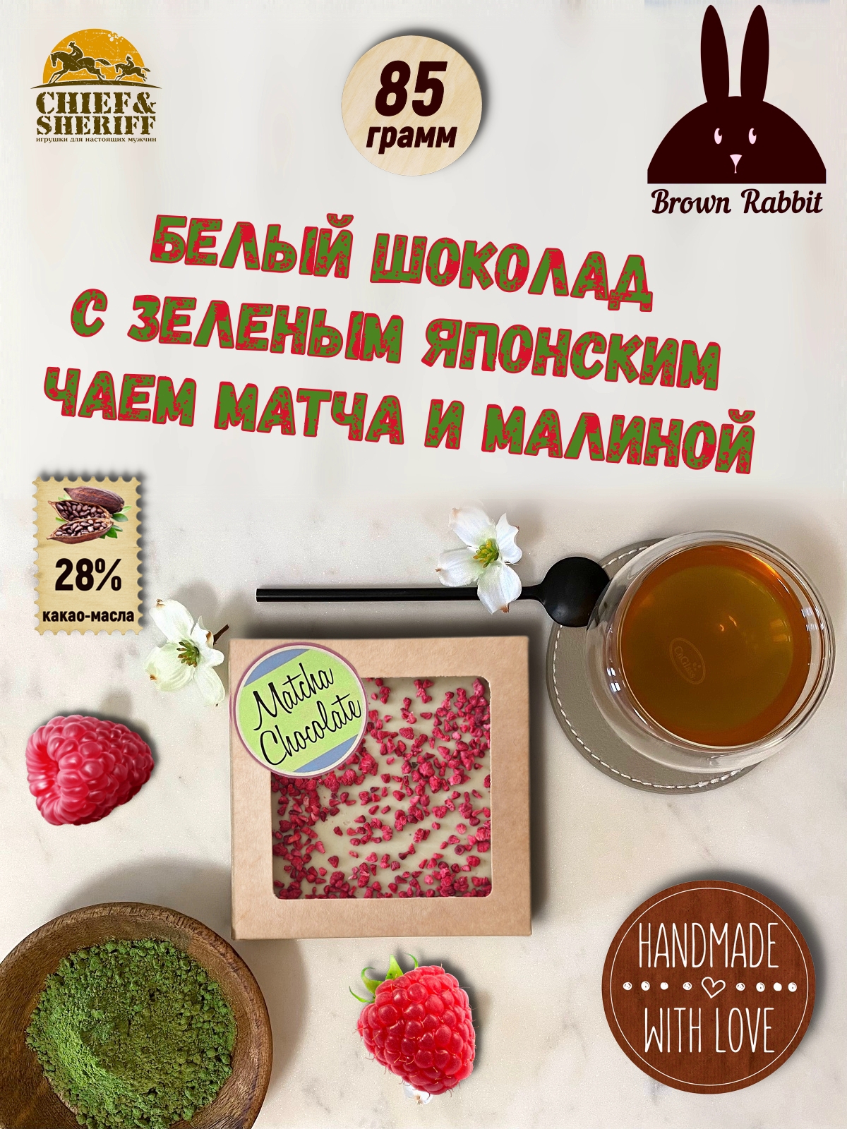Konnichiwa! (Здравствуйте, японский). Компания Brown Rabbit предлагает вам попробовать первоклассный натуральный белый шоколад ручной работы с добавлением малины и традиционного японского зелёного чая из региона Удзи префектуры Киото. Шоколад поставляется в подарочной крафтовой упаковке.