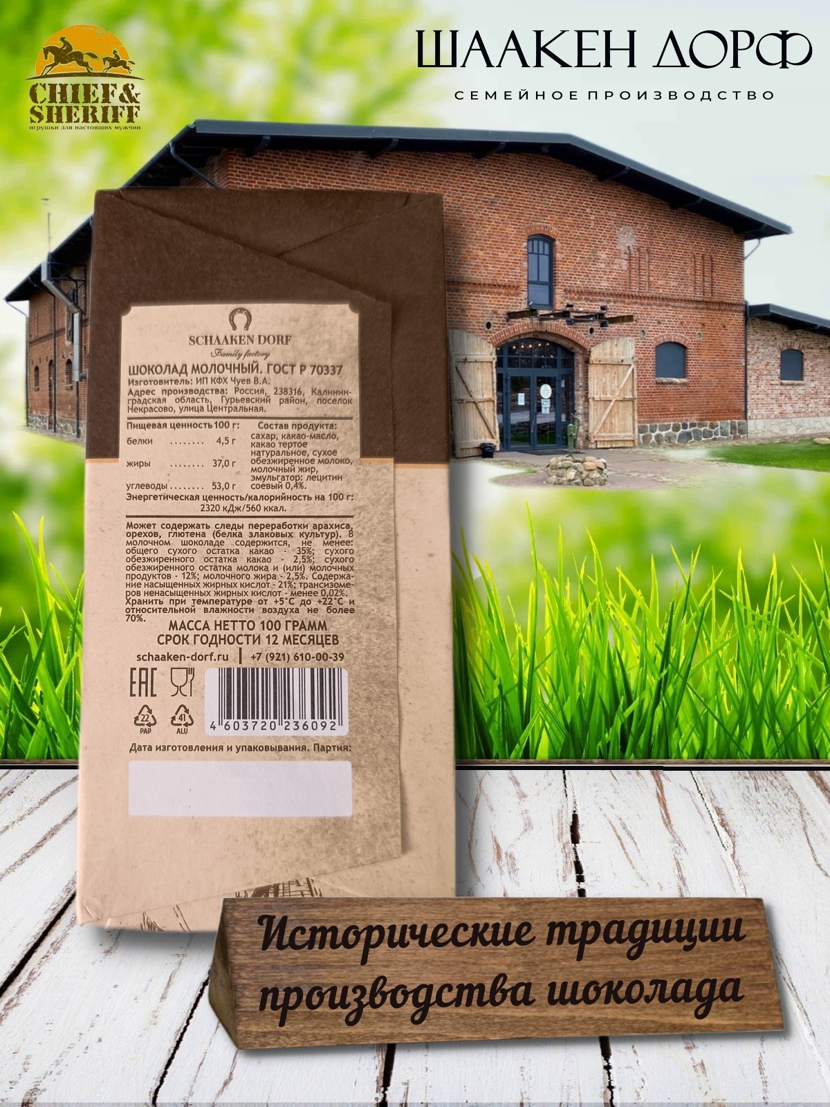 Шаакен Дорф - семейное производство сыра, марципана, шоколада, конфет и зефира. Производство компании Шаакен Дорф находится в Калининграде, в здании, которое когда-то было конюшней при замке Шаакен - рыцарей еще тевтонского ордена. Сейчас на первом этаже находится производство сыра. На втором этаже располагается небольшое кондитерское производство. Здесь вручную варится зефир, делаются карамелизированные апельсины в темном шоколаде, сублимированные ягоды, а также создается абсолютно разный и такой всеми полюбившийся калининградский марципан. В 2024 году, компания Шаакен Дорф стала победителем в номинациях «Лучшее туристическое направление года в номинации агротуризм», «Лучшее крестьянско-фермерское хозяйство», «Лучшее хозяйство в отрасли переработки молока», «Лучший объект туристического показа» и многих других!