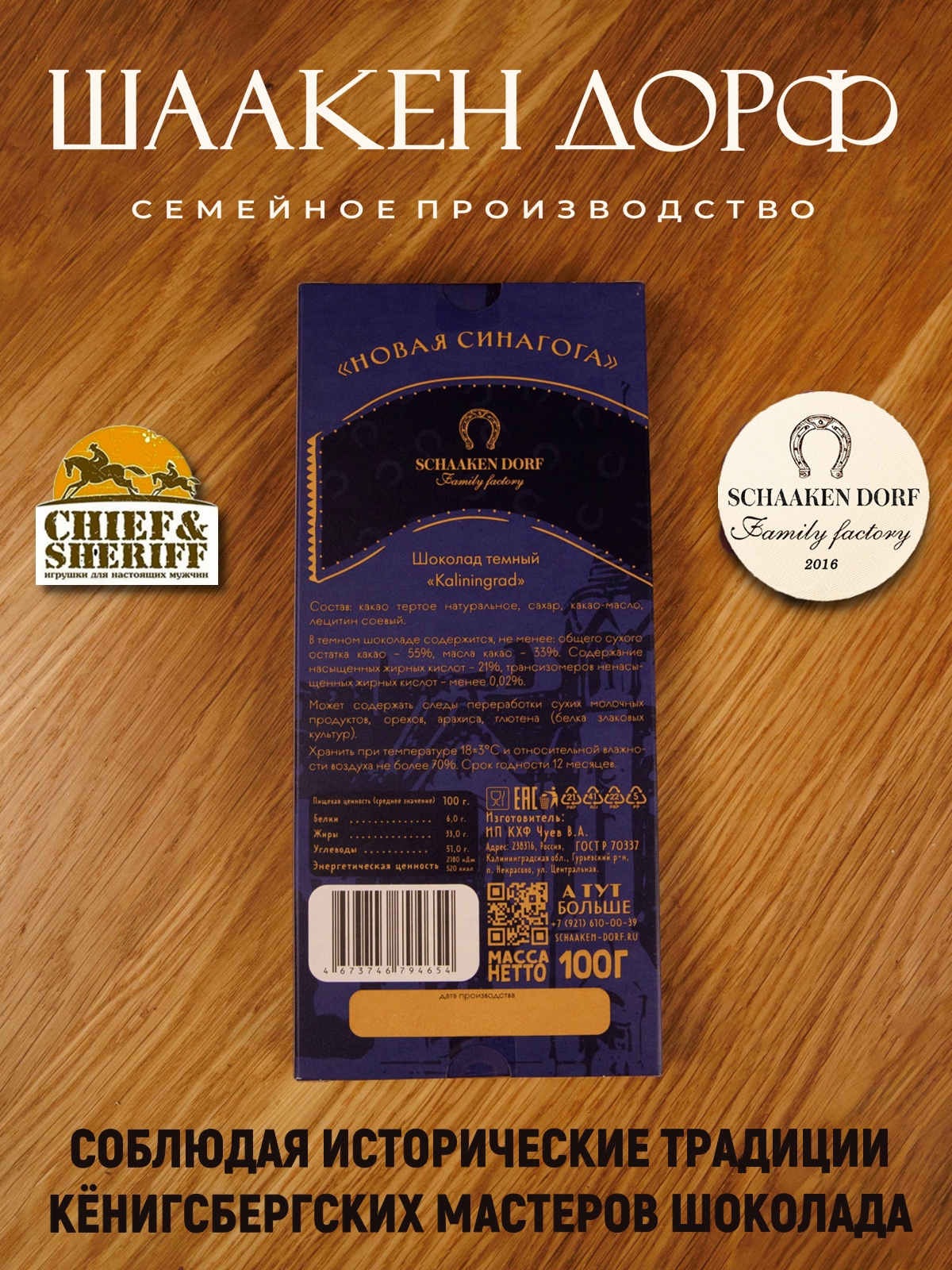Погрузитесь в мир изысканных вкусов с темным шоколадом от SCHAAKEN DORF, представленным в роскошной упаковке из серии "Города". На упаковке этого шоколада - город Калининград  и "Новая Синагога". Этот шоколад не только порадует вас своим насыщенным вкусом, ведь содержание какао там - 55%, но и станет отличным подарком для ваших близких. Каждая плитка весит 100 граммов, что делает ее идеальной для совместного наслаждения или индивидуального угощения.