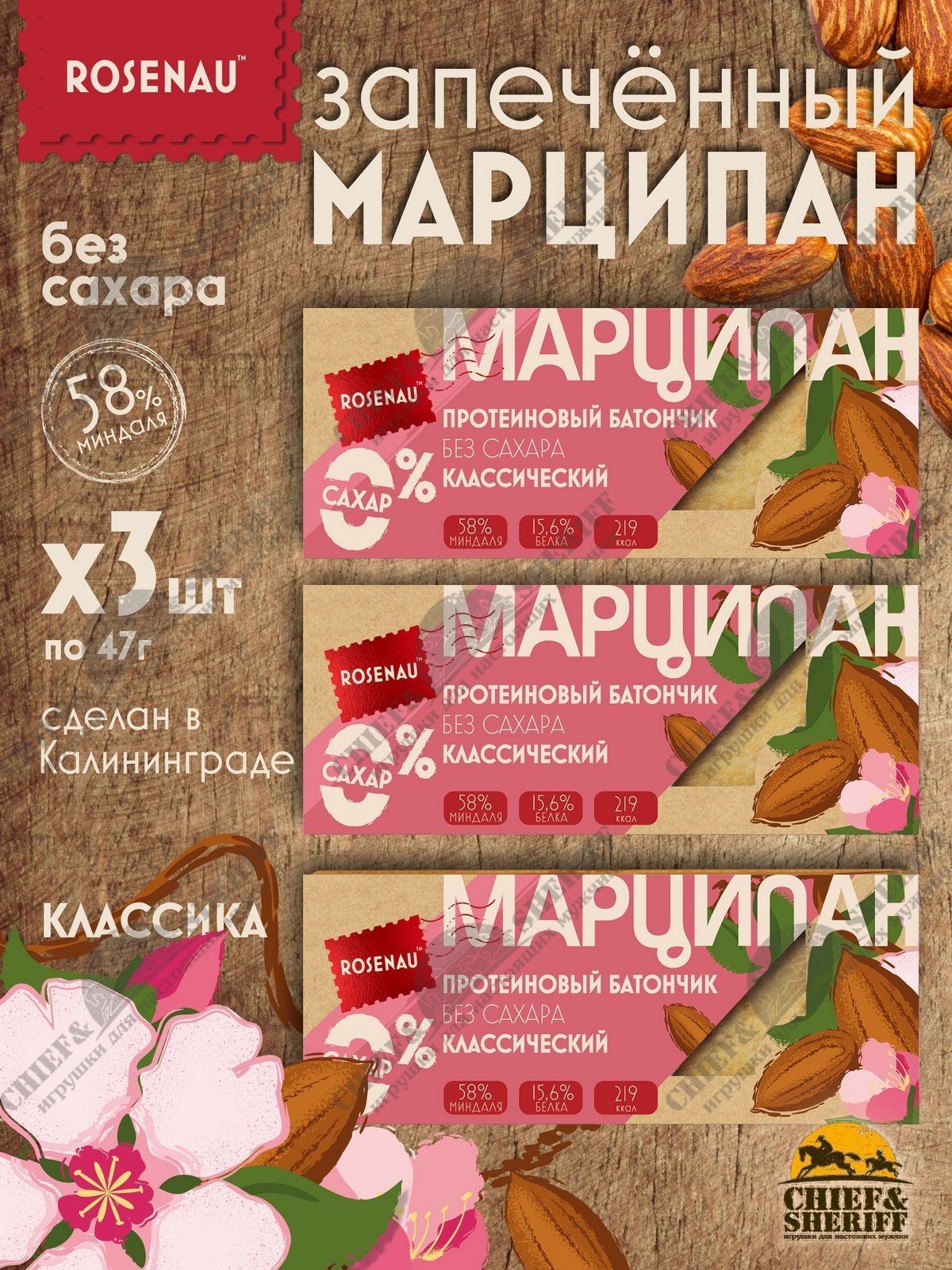 Марципан классический батончик без сахара, ROSENAU, 3 X 47 гр Марципан классический батончик без сахара, ROSENAU, 3 X 47 гр