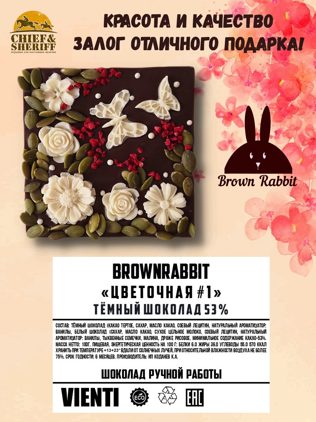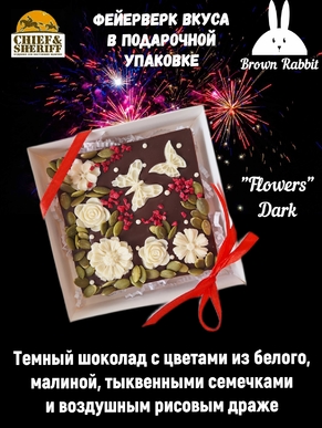 ЦВЕТОЧНАЯ №1. Тёмный шоколад, белый шоколад, малина, тыквенные семечки, Brown Rabbit, 100 гр