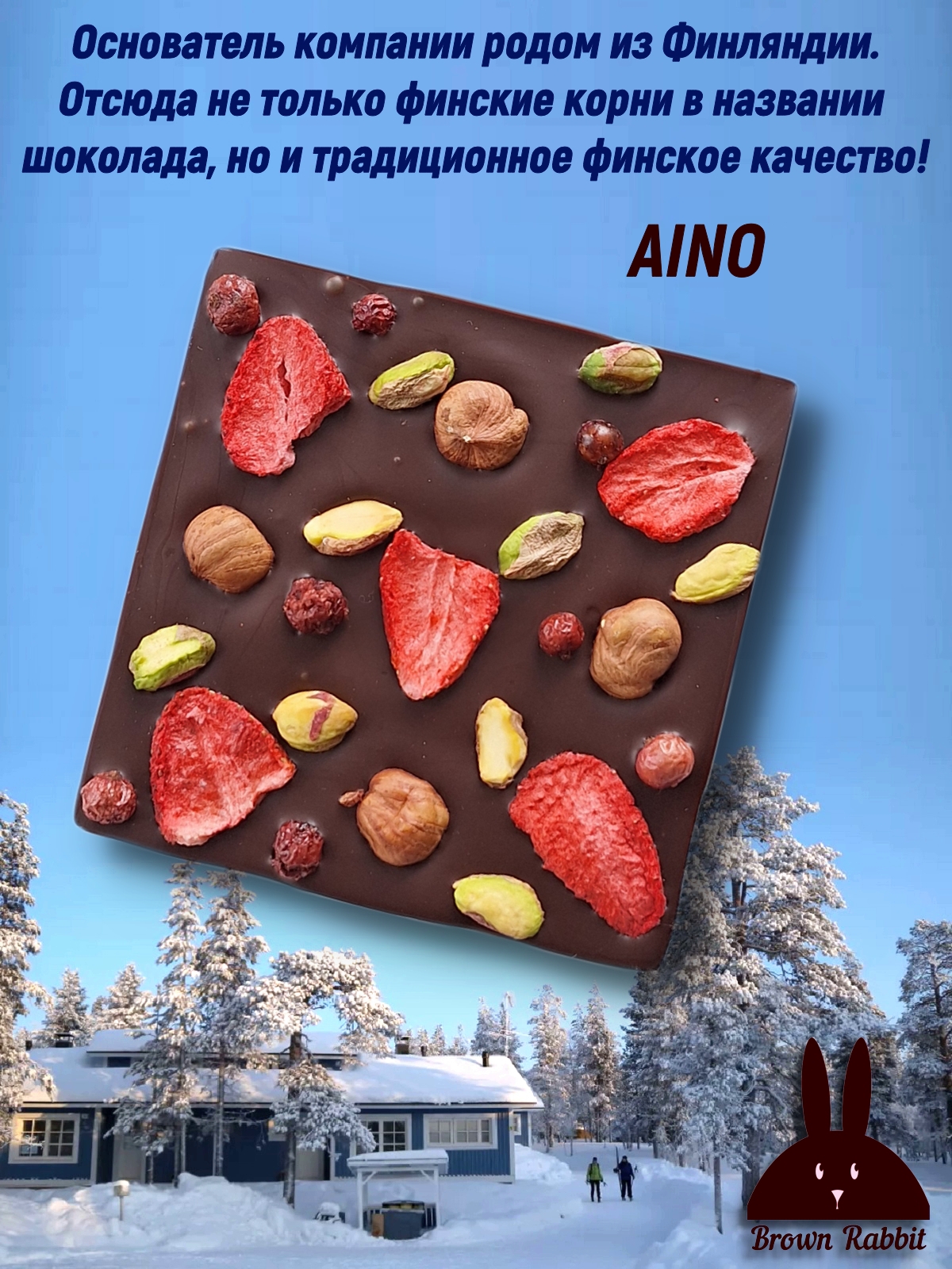 Возможно, вы уже пробовали шоколад с клубникой, шоколад с фисташками, шоколад с фундуком или шоколад с красной смородиной. С шоколадом Айно мы предлагаем вам насладиться элегантным сочетанием всех этих вкусов! Искренне надеемся, что наш шоколад понравится вам или доставит радость тому, кому вы преподнесете его в подарок - мы очень старались!