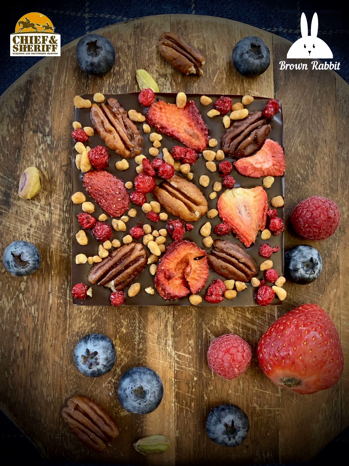 Состав: тёмный шоколад (какао тертое, сахар, масло какао, соевый лецитин, натуральный ароматизатор: ваниль), пекан, грецкий орех, клубника, красная смородина.