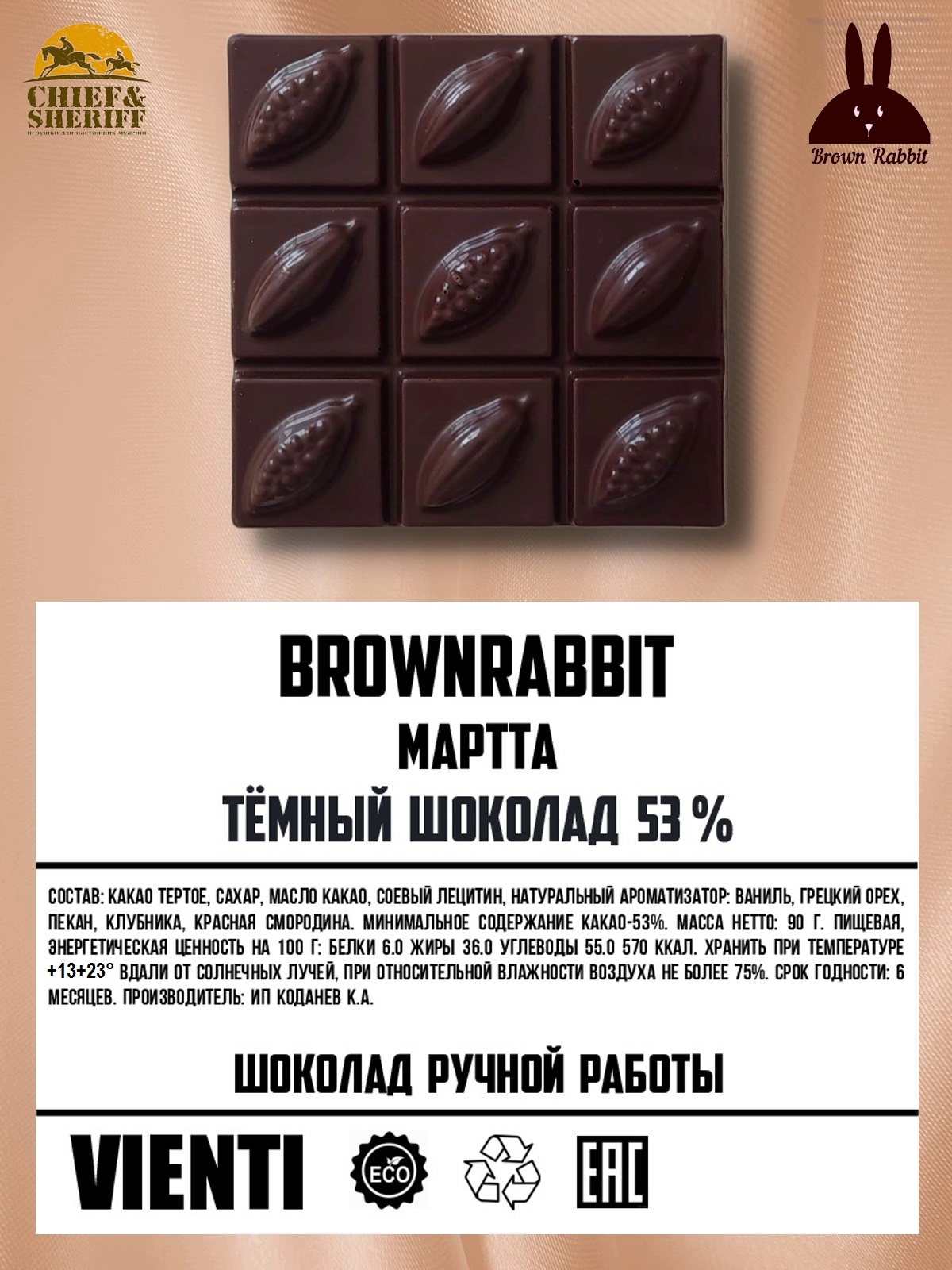 Тёмный шоколад MARTTA от компании Brown Rabbit - это первоклассный натуральный шоколад ручной работы в подарочной крафтовой упаковке.