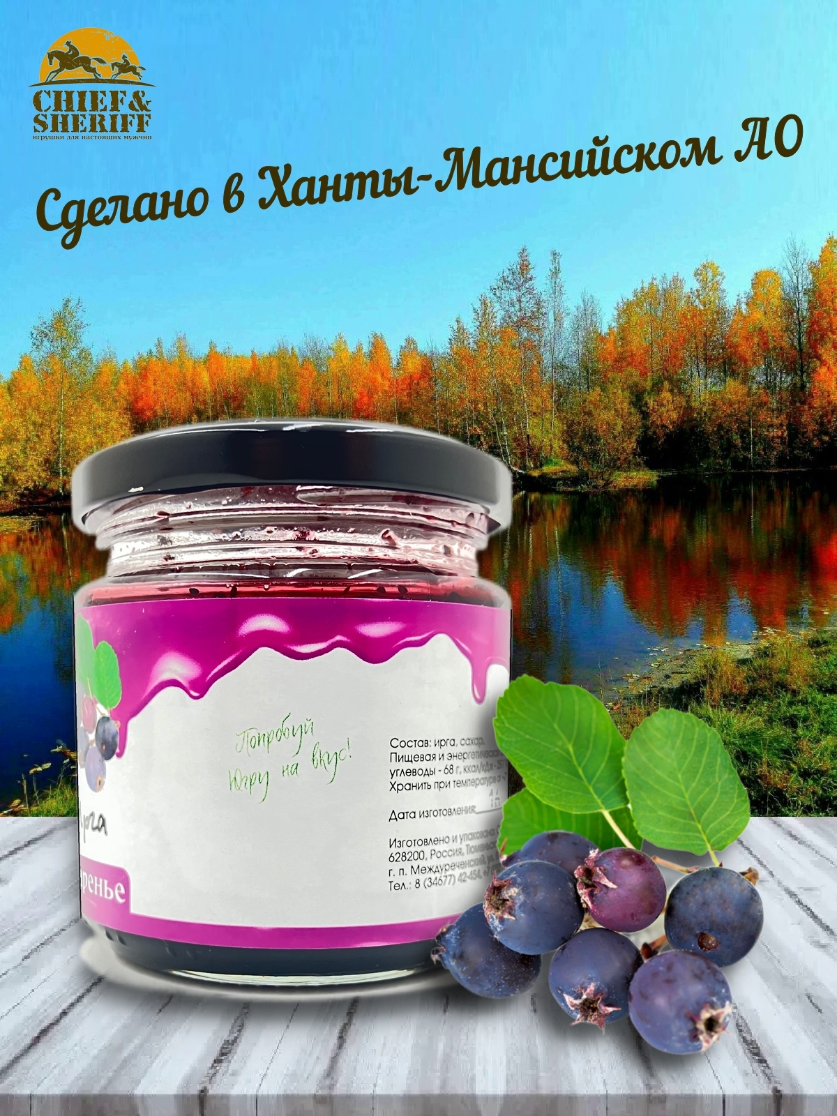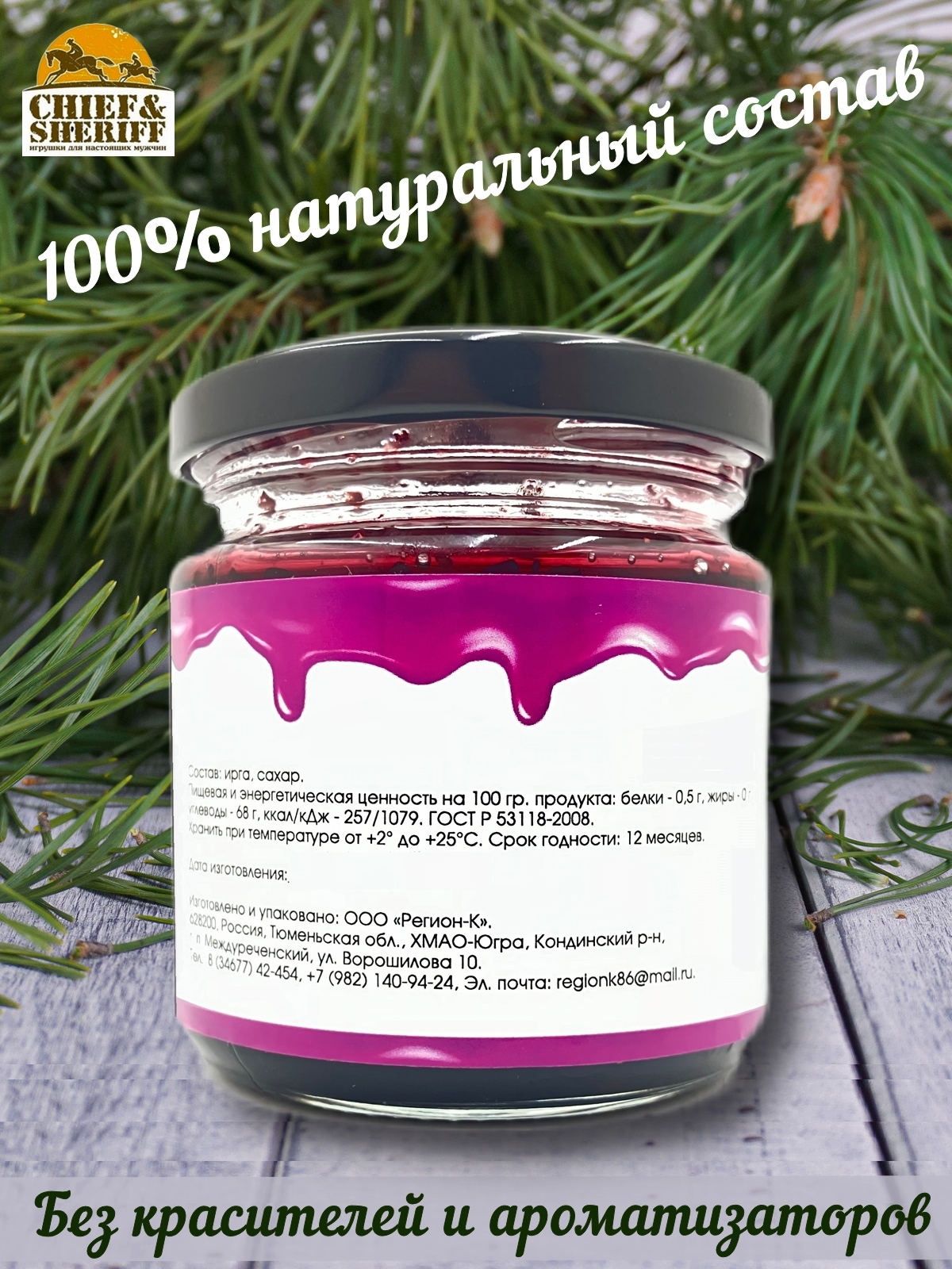 Ирга собрана в Ханты-Мансийском АО – Югре, одном из самых экологически чистых регионов России. При производстве варенья используются традиционные рецепты народов Севера по заготовке ягод. Никаких красителей и ароматизаторов - северные дикоросы, итак, обладают неповторимым вкусом и ароматом.