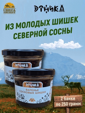Варенье "Сосновые шишки",  представленное сетом из 2 банок по 250 граммов — это уникальный и вкусный продукт, который станет настоящим украшением вашего стола. Каждая баночка наполнена композицией, приготовленной по традиционным рецептам коренных народов Ханты-Мансийского АО - ЮГРА, и позволяет насладиться неповторимым вкусом и ароматом сосны. Это варенье идеально подходит как для угощения к чаю, так и для приготовления различных десертов и выпечки.