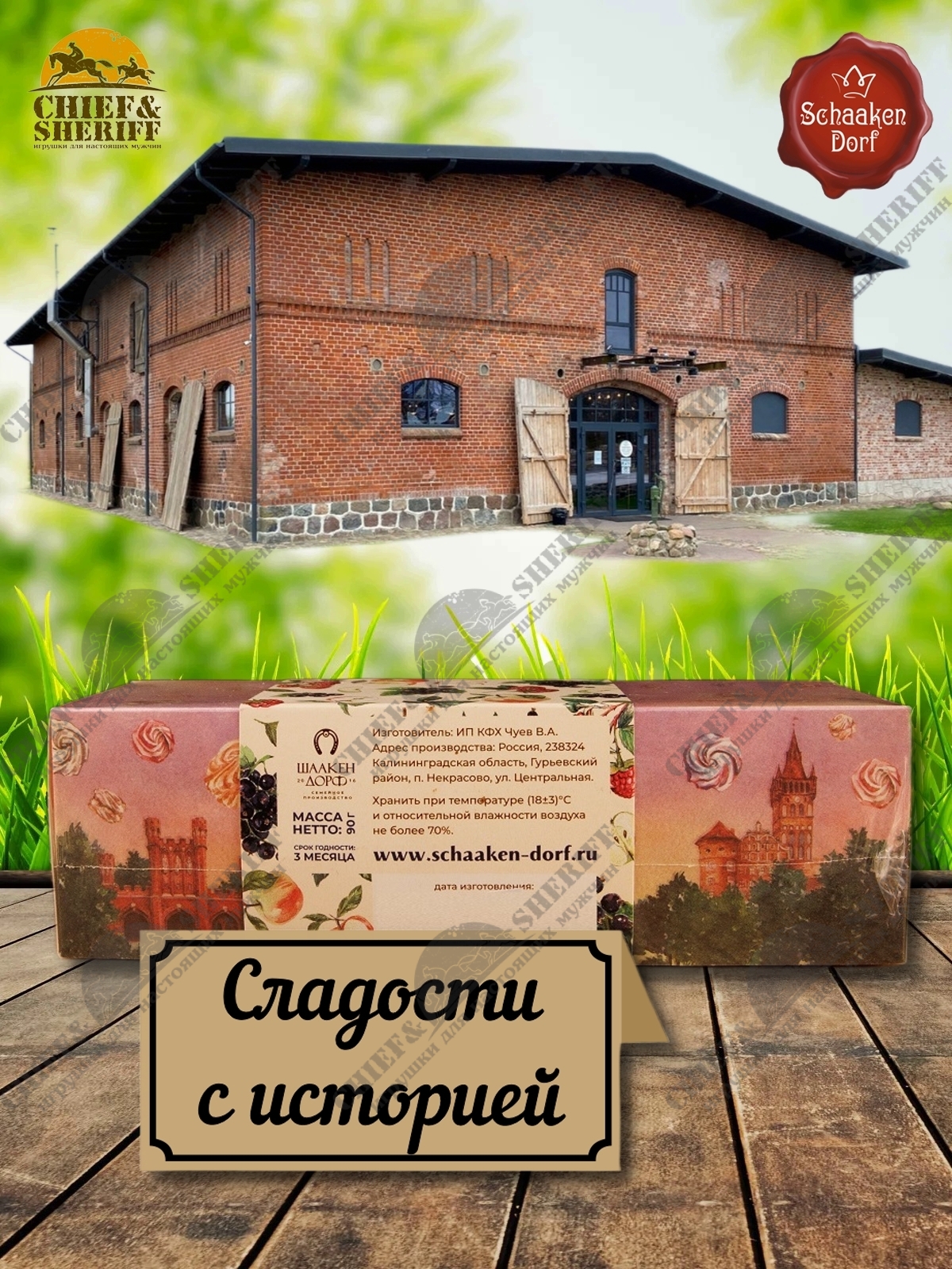 Шаакен Дорф - семейное производство сыра, марципана, шоколада, конфет и зефира. Производство компании Шаакен Дорф находится в Калининграде, в здании, которое когда-то было конюшней при замке Шаакен - рыцарей еще тевтонского ордена. Сейчас на первом этаже находится производство сыра. На втором этаже располагается небольшое кондитерское производство. Здесь вручную варится зефир, делаются карамелизированные апельсины в темном шоколаде, сублимированные ягоды, а также создается абсолютно разный и такой всеми полюбившийся калининградский марципан. В 2024 году, компания Шаакен Дорф стала победителем в номинациях «Лучшее туристическое направление года в номинации агротуризм», «Лучшее крестьянско-фермерское хозяйство», «Лучшее хозяйство в отрасли переработки молока», «Лучший объект туристического показа» и многих других!