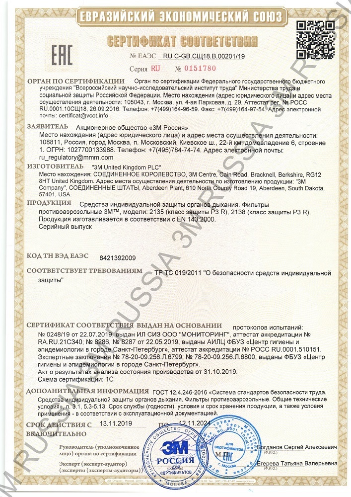 С применением высокоэффективных противоаэрозольных фильтров 3М 2135 полумаски серий 3М 7500, 6500QL и 6000 защищают до 50 ПДК, полнолицевые маски серии 3М 6000 - до 200 ПДК.